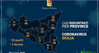 Questa la divisione degli attuali positivi nelle varie province: #Agrigento, 75 (0 ricoverati, 2 guariti e 1 deceduto); #Caltanissetta, 61 (19, 3, 4); #Catania, 368 (136, 16, 23); #Enna, 181 (92, 1, 10); #Messina, 266 (129, 8, 15); #Palermo, 216 (78, 14, 6); #Ra